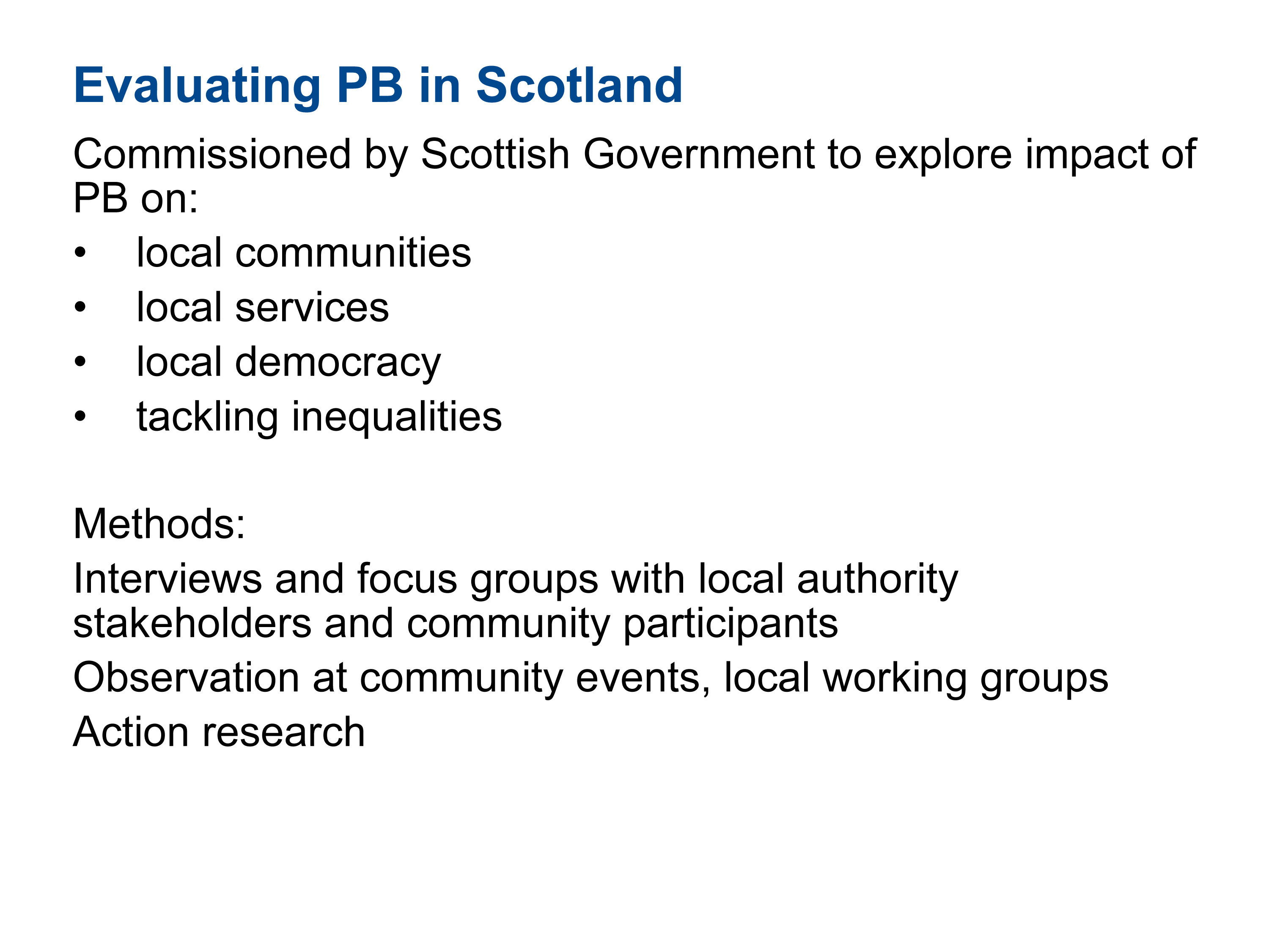 - Bruce Ryan: [The work] has characterised generations of PB in Scotland – [and how PB] reacts to (changing) policy environment.