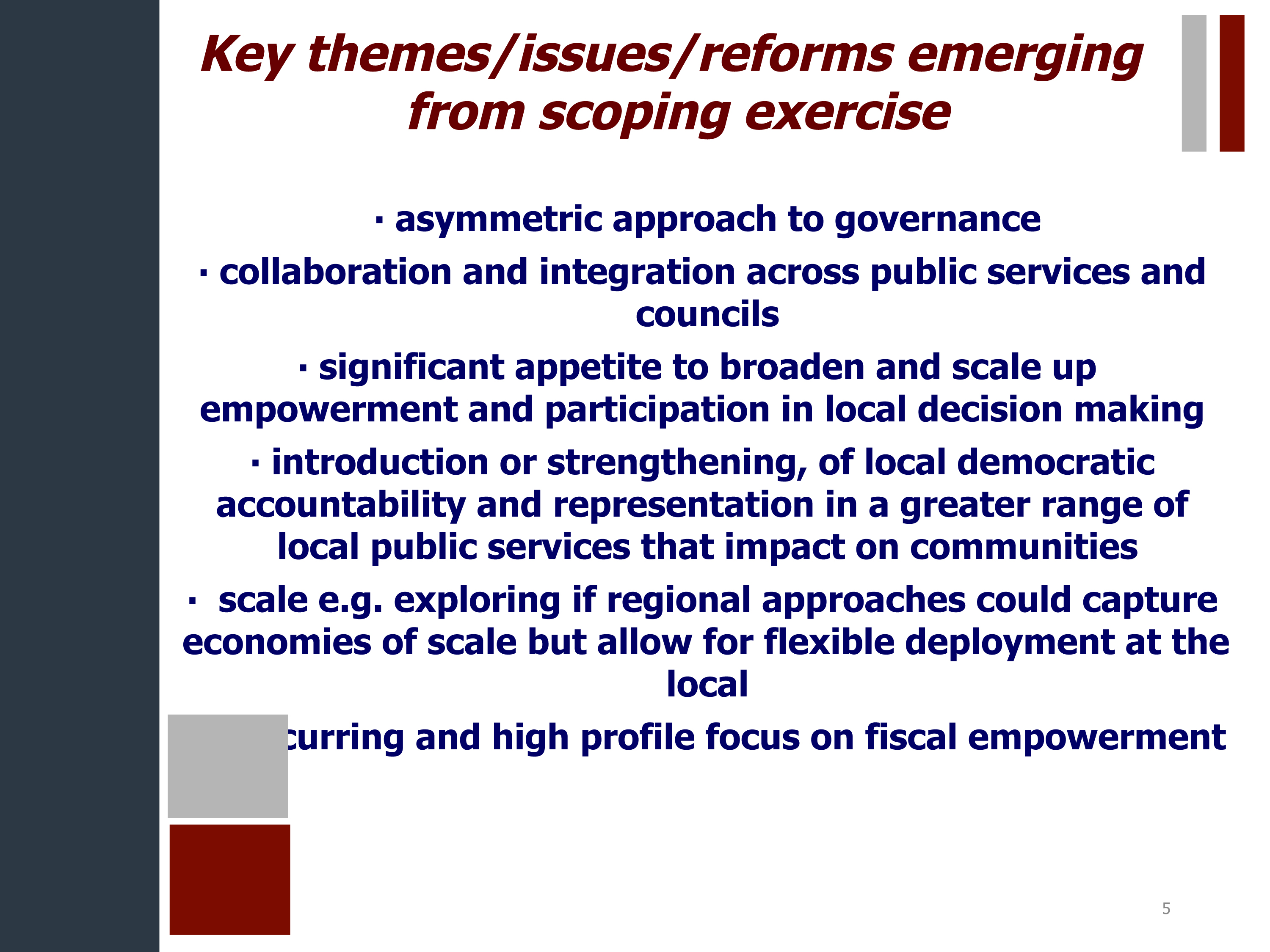 - Bruce Ryan: James Mitchell now says: (5) scale, e.g. exploring if regional approaches could get economies of scale but flexible deployment at the local; (6) much focus on fiscal autonomy/empowerment.