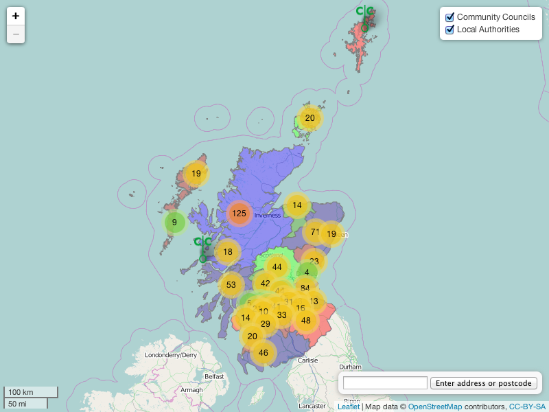 So I reasoned ‘if I can’t add their stuff to mine, can I add my stuff to theirs?’ That is, could I swap in my LA and CC data sets and use leaflet’s code to colour them and pick out data to be displayed in their external control? This seemed to go OK until I added in the geocoder (the bit for entering an address to zoom to that area of the map. This code failed, so everything that should have been processed after it wasn’t even reached.